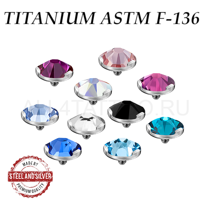 Накрутка из имплантационного титана ASTM F-136. Украшена кристаллом Swarovski. Резьба накруток 1,2мм подходит к микродермалам и украшениям толщиной 1,6мм с внутренней резьбой. За счет того что кристалл не в обкатке, а в закрепе из трех маленьких лапок - накрутка выглядит значительно ярче.