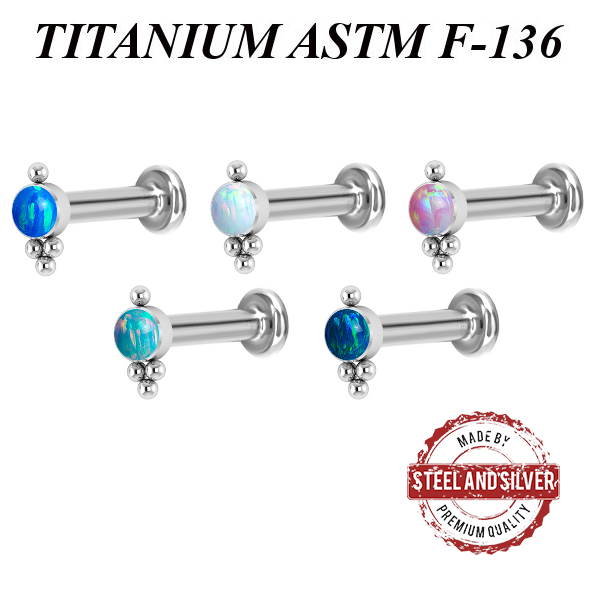 Лабрет из имплантационного титана 6Al-4V-Eli ASTM: F-136 с внутренней резьбой. Украшен искусственным опалом диаметром 3 мм.