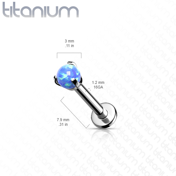 Лабрет с внутренней резьбой из имплантационного титана 6Al-4V-Eli ASTM: F-136. Украшен шариком из искусственного опала диаметром 3мм.