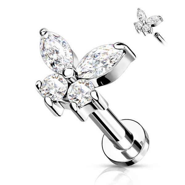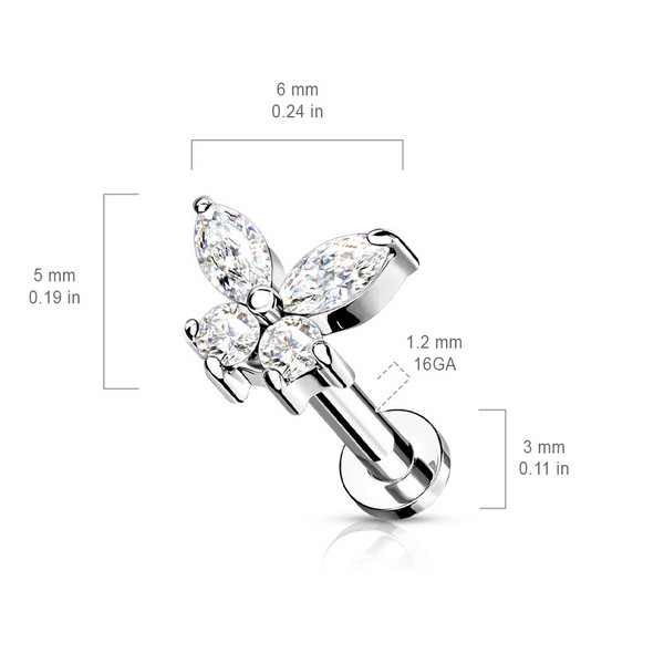 Лабрет с внутренней резьбой из хирургической стали 316L и накрутки из латуни с родированием. Украшен стразами. Размер декоративной части - 5х6мм.