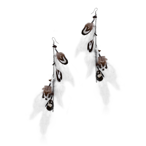 Серьги из хирургической стали 316L с подвеской, сочетающей перья, цепочки и декоративные камушки. Общая длина декоративной части - 27cм.