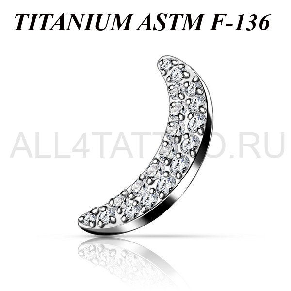 Накрутка из имплантационного титана 6Al-4V-Eli ASTM: F-136 в форме полумесяца, украшенного множеством прозрачных кристаллов. Размер декоративной части: 5х10мм.
