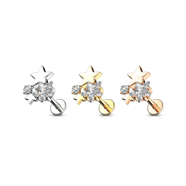 Лабрет из хирургической стали 316L с внутренней резьбой. Представлен в трёх вариантах: классический стальной и с покрытием жёлтого и розового золота. Накрутка из родированной латуни с золотым IP покрытием, украшена фианитами. Размер накрутки: 6х7мм.
