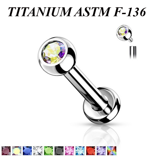 Лабрет из имплантационного титана 6Al-4V-Eli ASTM: F-136 с внутренней резьбой и цветным фианитом.