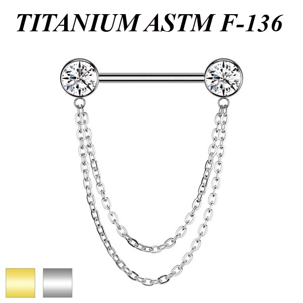 Безрезьбовое украшение для груди из имплантационного титана 6Al-4V-Eli ASTM: F-136 с прозрачными фианитами и двойной цепочкой. Представлено в двух вариантах: классическое титановое и с золотым PVD покрытием.